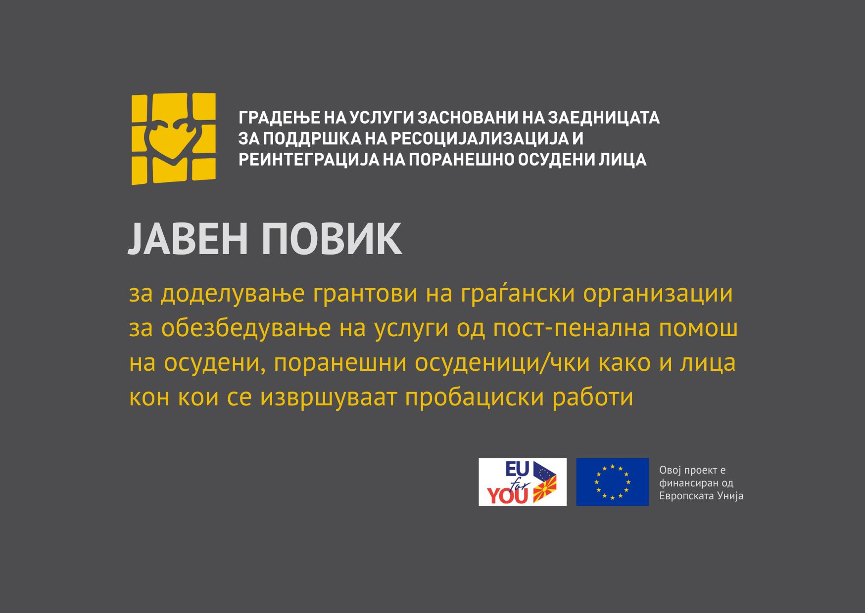 Македонското здружение на млади правници (МЗМП) во рамки на проектот „Воспоставување услуги во заедницата за поддршка на ресоцијализација и реинтеграција на поранешни осуденици “ финансиски поддржан од Европската Унија објавува: ЈАВЕН ПОВИК за доделување грантови на граѓански организации за обезбедување на услуги од пост-пенална помош на осудени, поранешни осуденици/чки